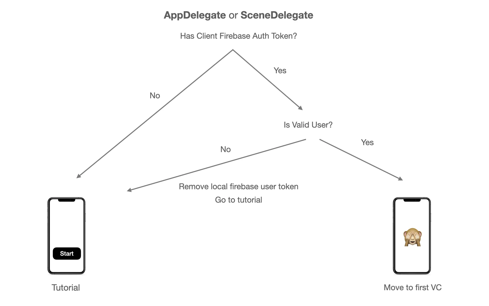 Auth Flow 이후, 결과에 따라 TutorialVC or FirstVC 를 keywindow의 rootViewController 로 할당 후, makeKeyAndVisible() 을 통해 사용자에게 제공합니다.