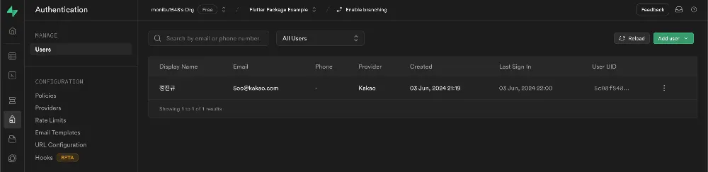 Supabase의 Authentication에서 현재 회원가입 유저들의 목록을 확인할 수 있습니다.