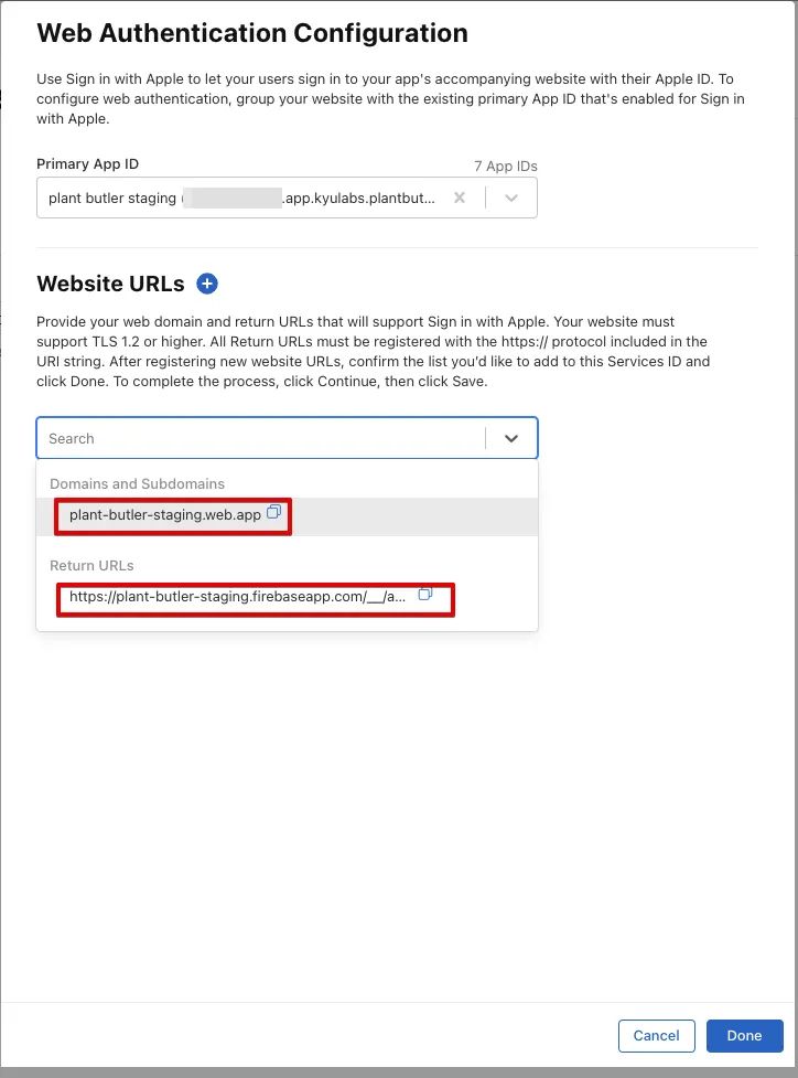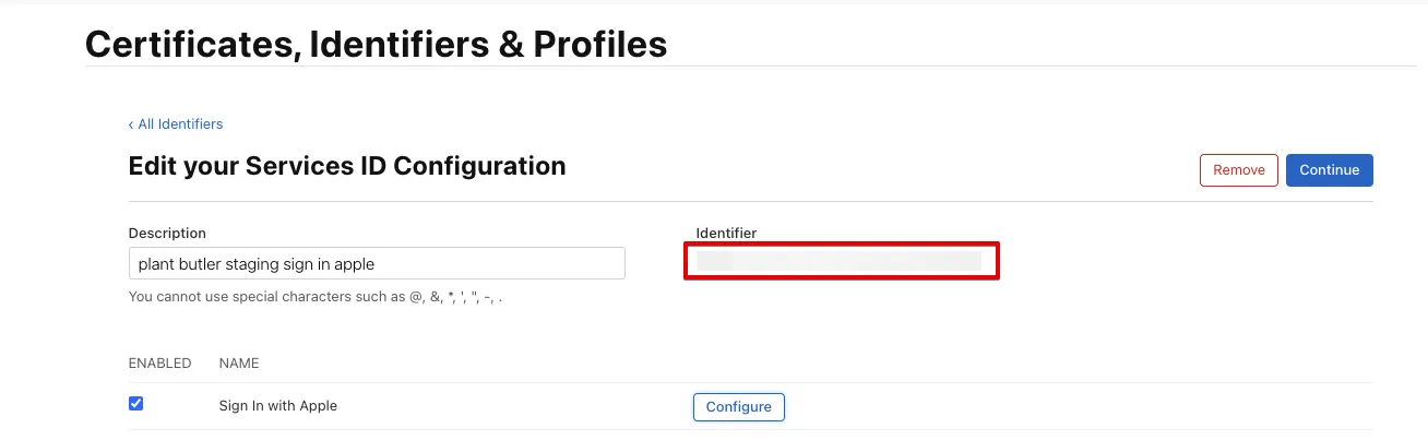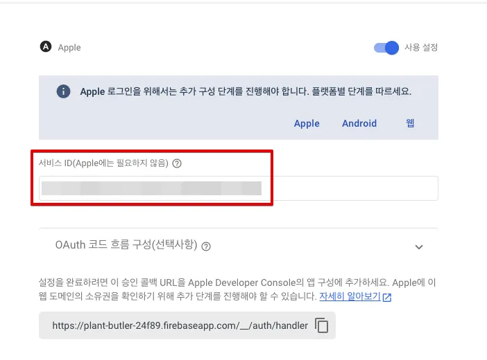 2번에서 생성된 “Identifier” 를 Firebase Apple 로그인 설정에서 서비스 ID로 넣습니다.