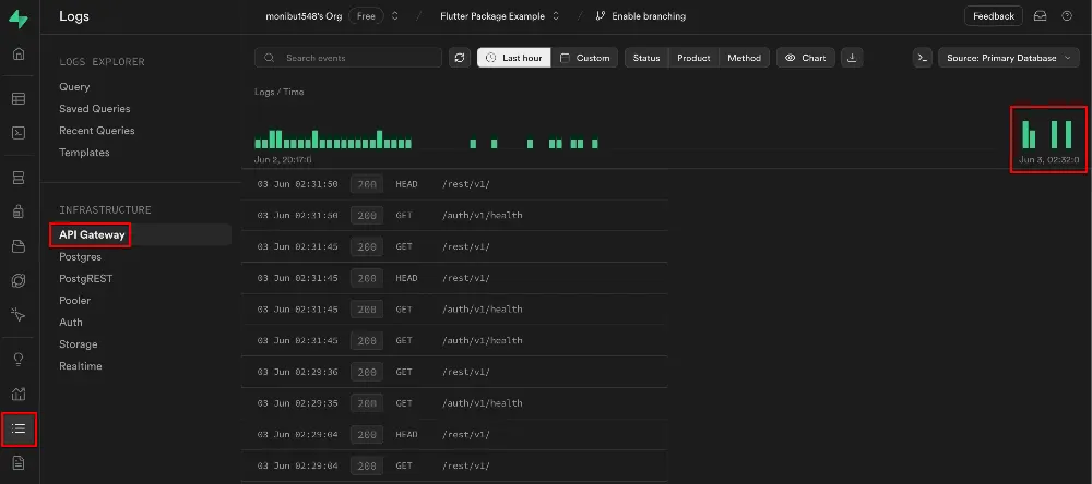 Supabase가 초기화 되면 Supabase 웹 콘솔에서 로그가 남게됩니다.