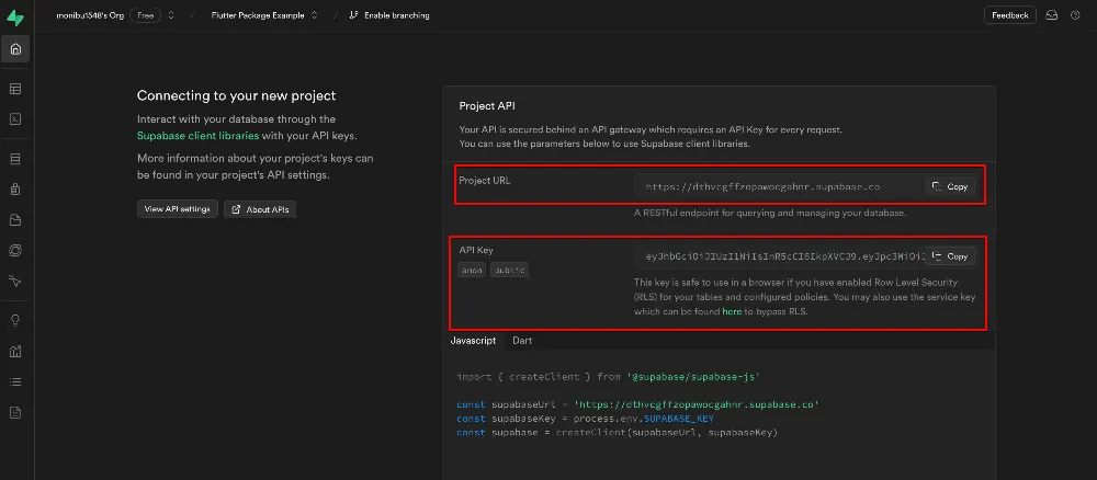 Project URL과 API Key를 복사합니다. Flutter에서 Supabase 초기화 시점에 사용됩니다.