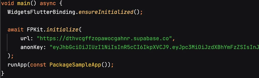 Flutter Package 프로젝트 생성 시 추가된 "프로젝트명.dart"을 수정합니다. 불필요한 Calculator 코드를 제거하고, 대신에 아래의 Supabase 초기화 코드를 추가합니다.