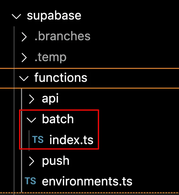 supabase/functions/batch 디렉토리가 생성되며 기본 index.ts 파일도 함께 생성됩니다.