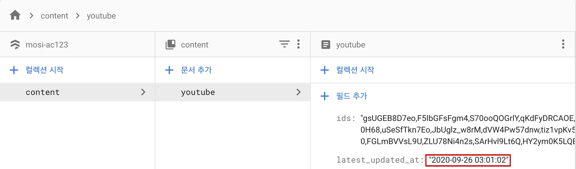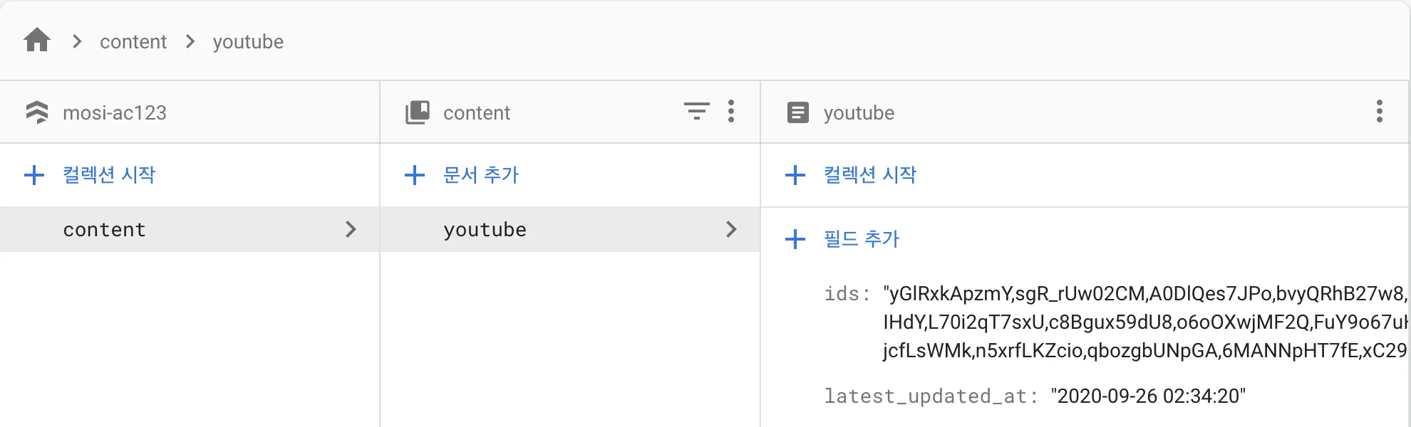 위 과정에서 가져온 Youtube ID 들을 Firestore 에 저장합니다