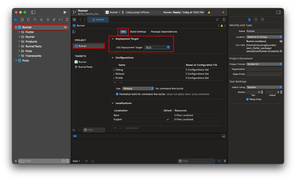 iOS Deployment Target을 13이상으로 변경합니다. (15.0으로 변경하겠습니다.)