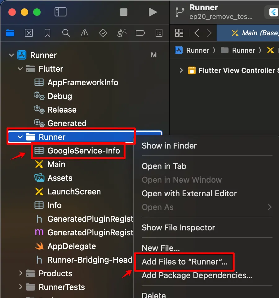 Runner 디렉토리 하위에 GoogleService-Info.plist 파일이 있어야하며 없다면 Runner 마우스 우측 클릭 > Add Files to “Runner” …. 메뉴를 통해 GoogleService-Info.plist파일을 Runner 하위로 가져와야 합니다.