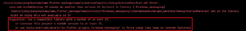 오류 문구 그대로 firebase_messaging 15.0.1은 Android 최소지원 버전을 API21로 지정하고 있는데, 현재 서비스 앱에서는 API 19로 지정되어 있어 오류가 발생한 것입니다.