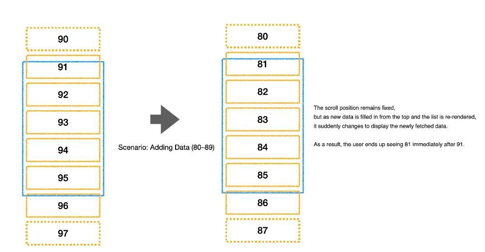 When the user scrolls up and pagination occurs, the data does not naturally continue from 91 to 90. Instead, an awkward situation arises where 81 appears immediately after 91.