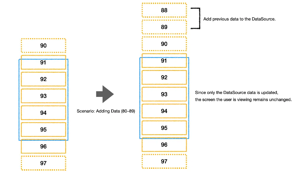 However, with SwiftUI’s List, any change to the bound data is treated as a state change, which triggers a full re-render of the List. This behavior causes the scroll position to reset or shift during prev pagination, leading to a disorienting user experience. Such issues significantly degrade UX and make pagination scenarios challenging to implement cleanly in SwiftUI.