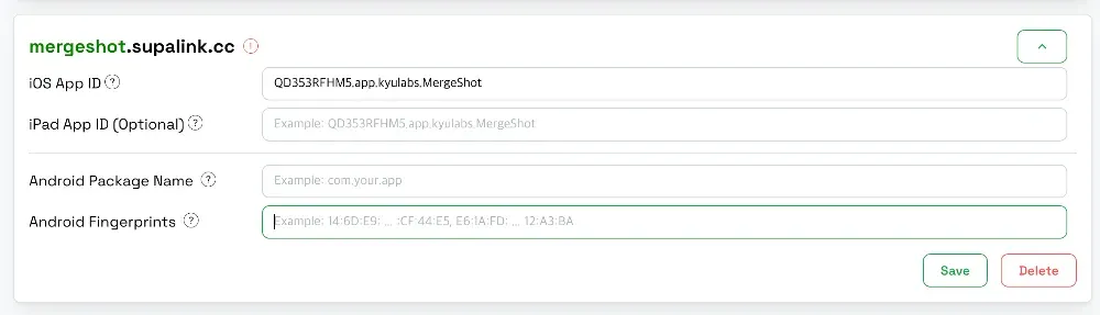 입력한 정보는 iOS Universial Link, Android의 Asestlink.json에 포함되는 정보가 됩니다.