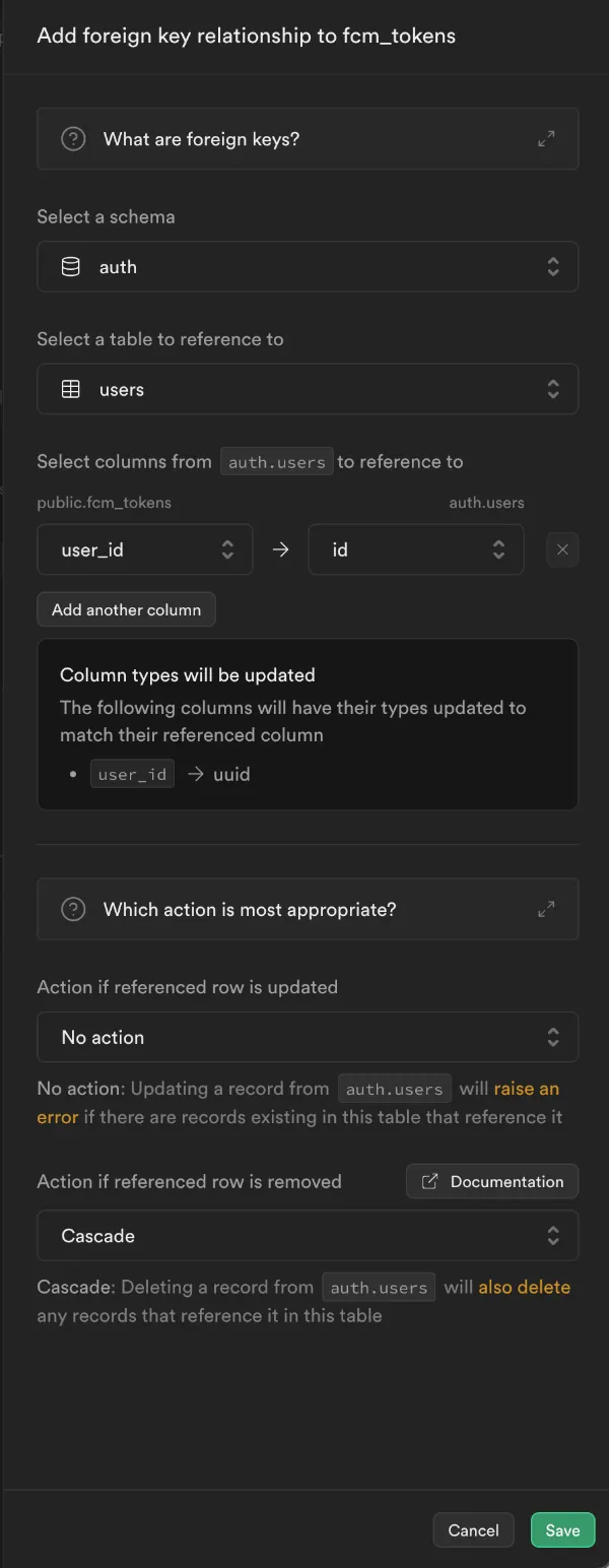 auth.users 테이블에서 유저가 삭제되면 삭제된 유저의 ID를 기준으로 fcm_tokens 테이블에서 해당 user_id의 토큰을 모두 삭제합니다.