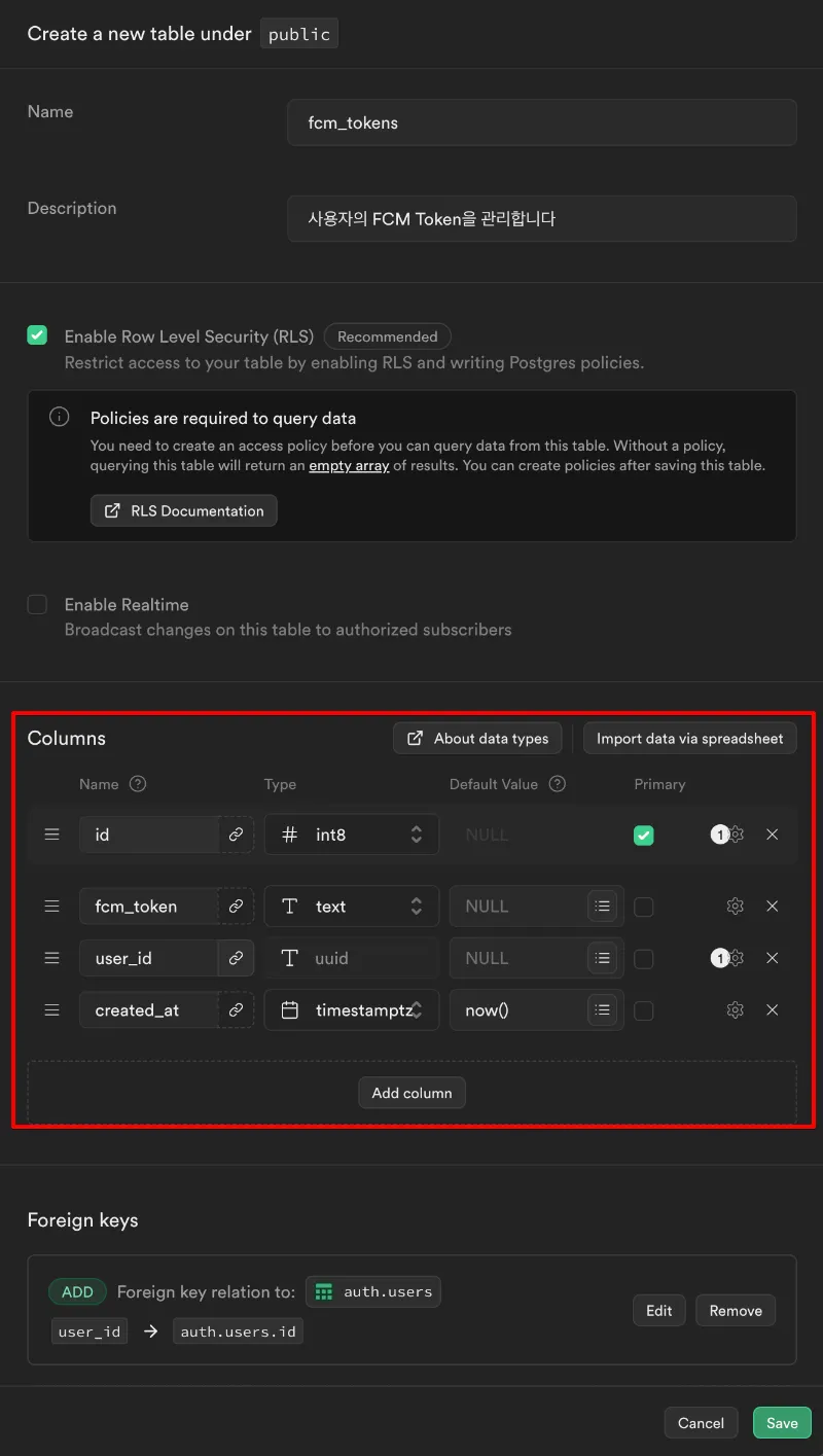 푸시 알림을 발송하기 위해 필요한 FCM Token을 저장할 테이블을 생성하겠습니다.