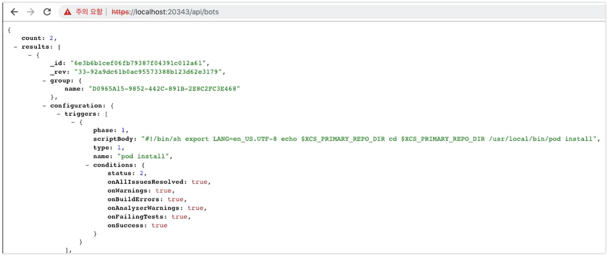 GET https://{xcode server ip}:20343/api/bots : Bots 정보 백업