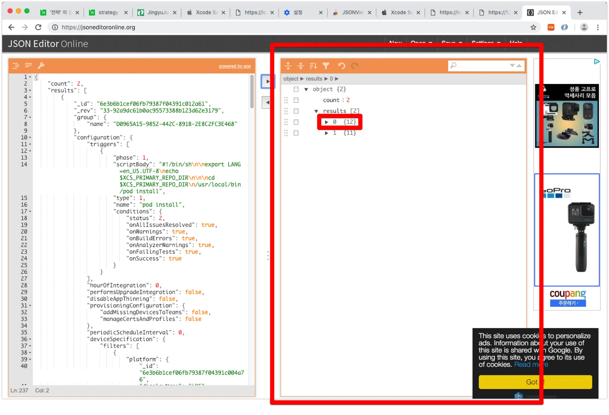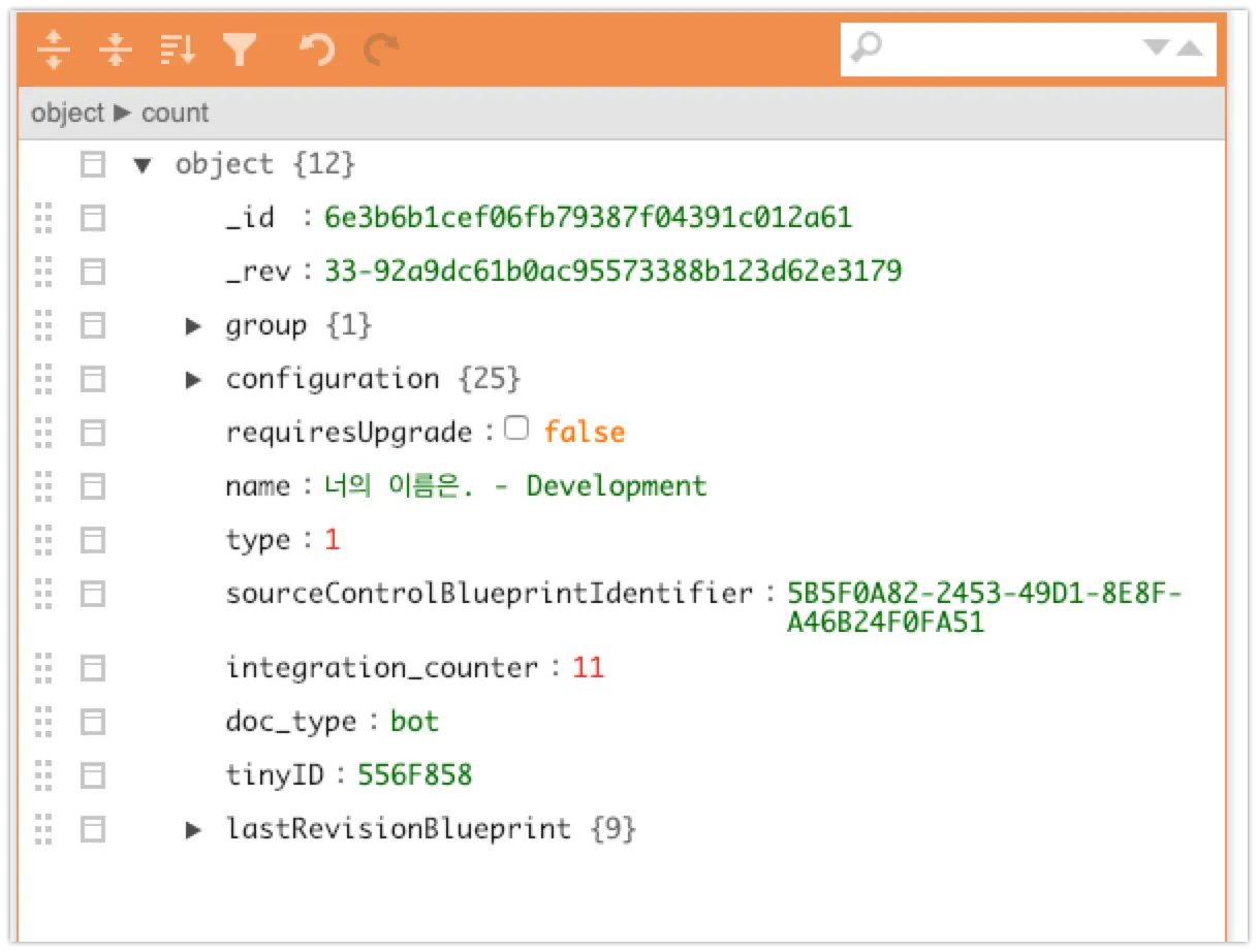 api/bots 에서 가져온 봇의 정보를 https://jsoneditoronline.org/ 에 넣으면 json의 형태로 쉽게 구조화 할 수 있는데요,여기서 우측 result 배열의 요소가 각 bot에 해당합니다.