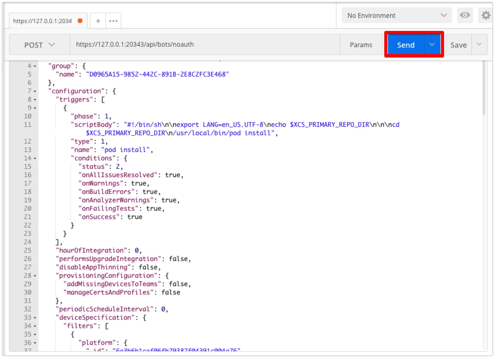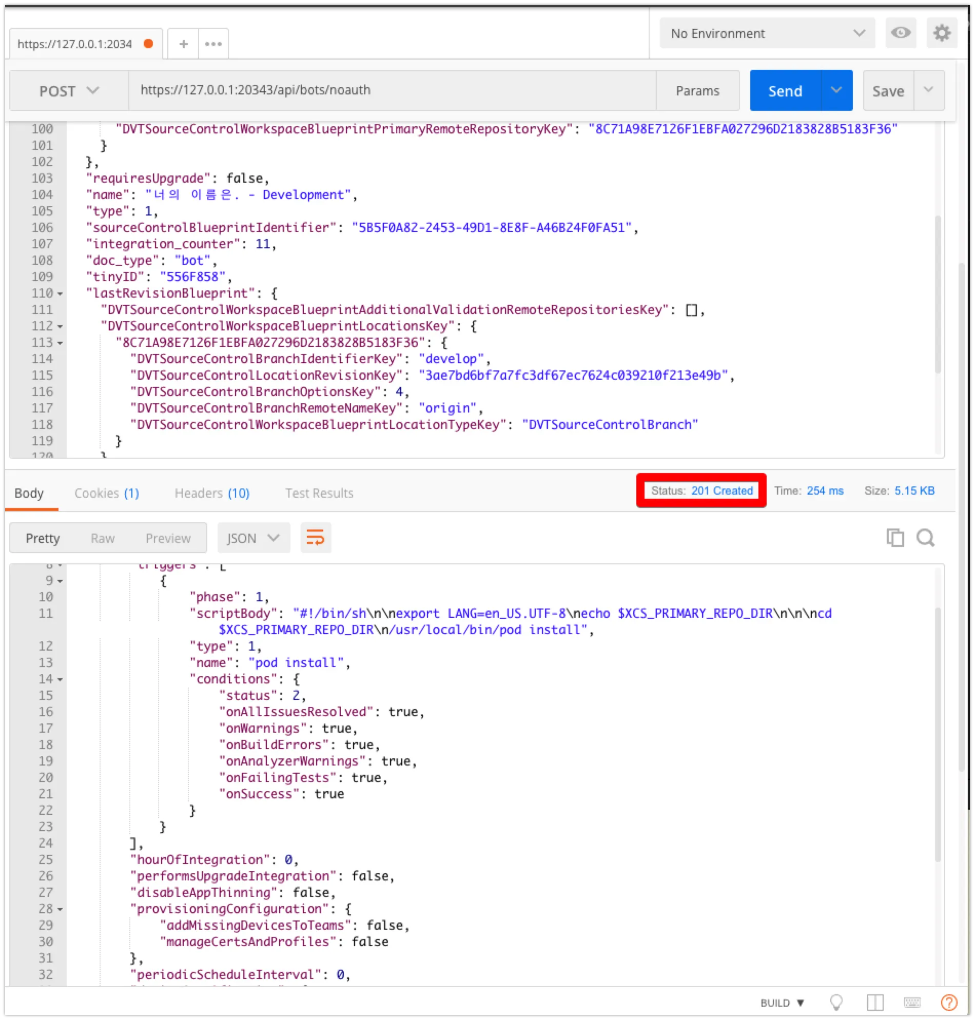 POST https://{xcode server ip}:20343/api/bots/noauth : 백업한 정보를 이용해 등록