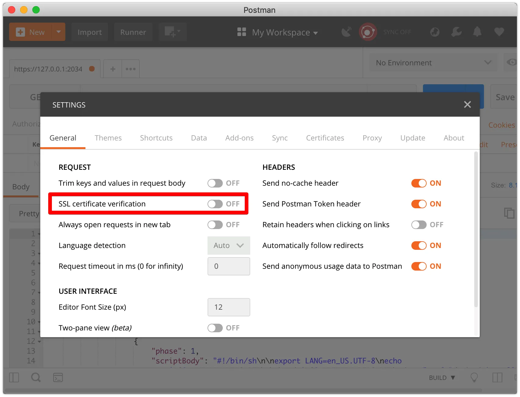 먼저 https로 요청을 보내기 때문에, postman에서 한가지 옵션을 설정해야 합니다. Settings > General 에서 SSL certificate verification 옵션을 OFF로 설정합니다.