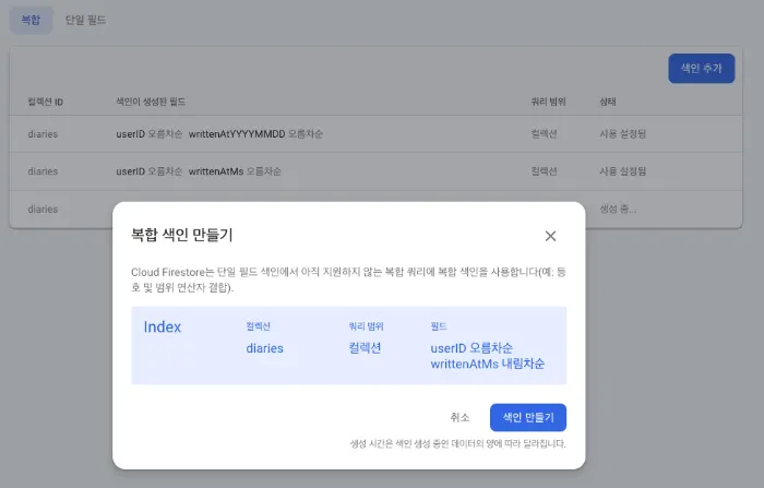 Firestore에서 검색(where), 정렬(orderBy)를 하기 위해서는 색인이 생성되어 있어야 한다. 색인 생성방법은 고민할 필요 없다.색인이 생성되지 않아 발생한 오류에 색인 생성을 위한 주소를 던져준다.