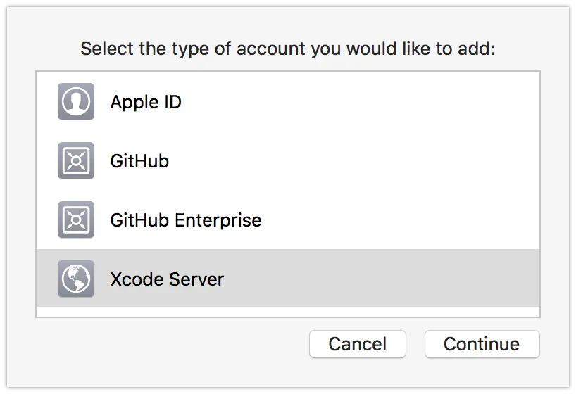 그 후 XCode Server에서 권한을 부여받은 계정을 입력해주면 끝!