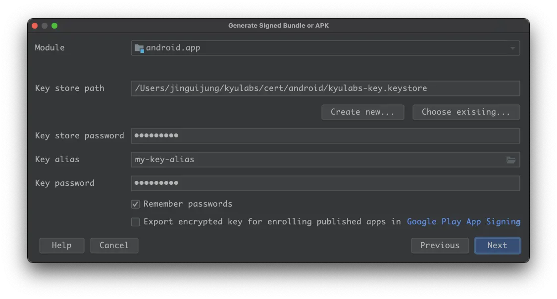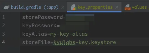 key.properties에 작성했던 내용들 채워줍니다.