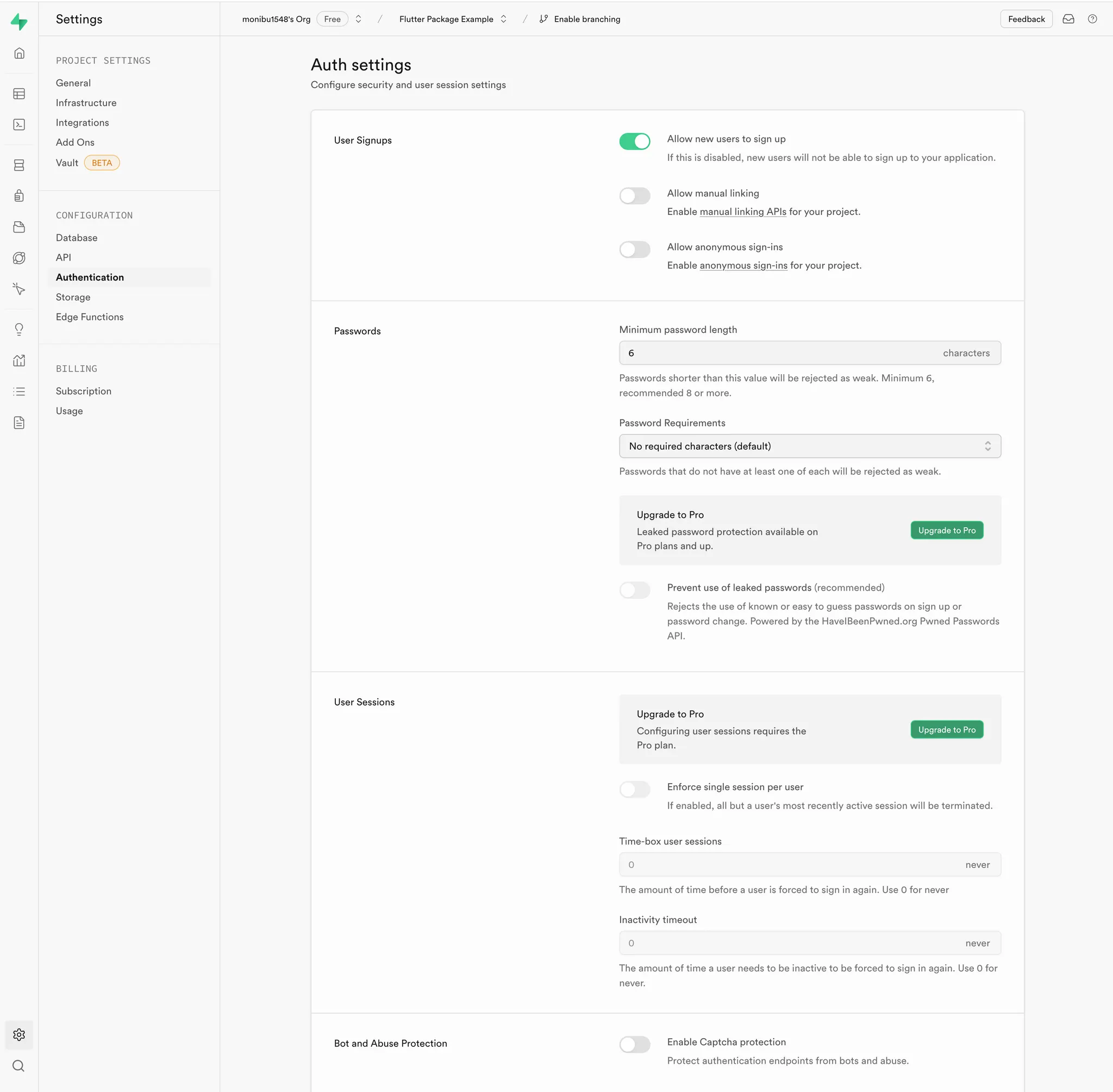 Settings > Authentication에서 세부적인 항목 설정 가능