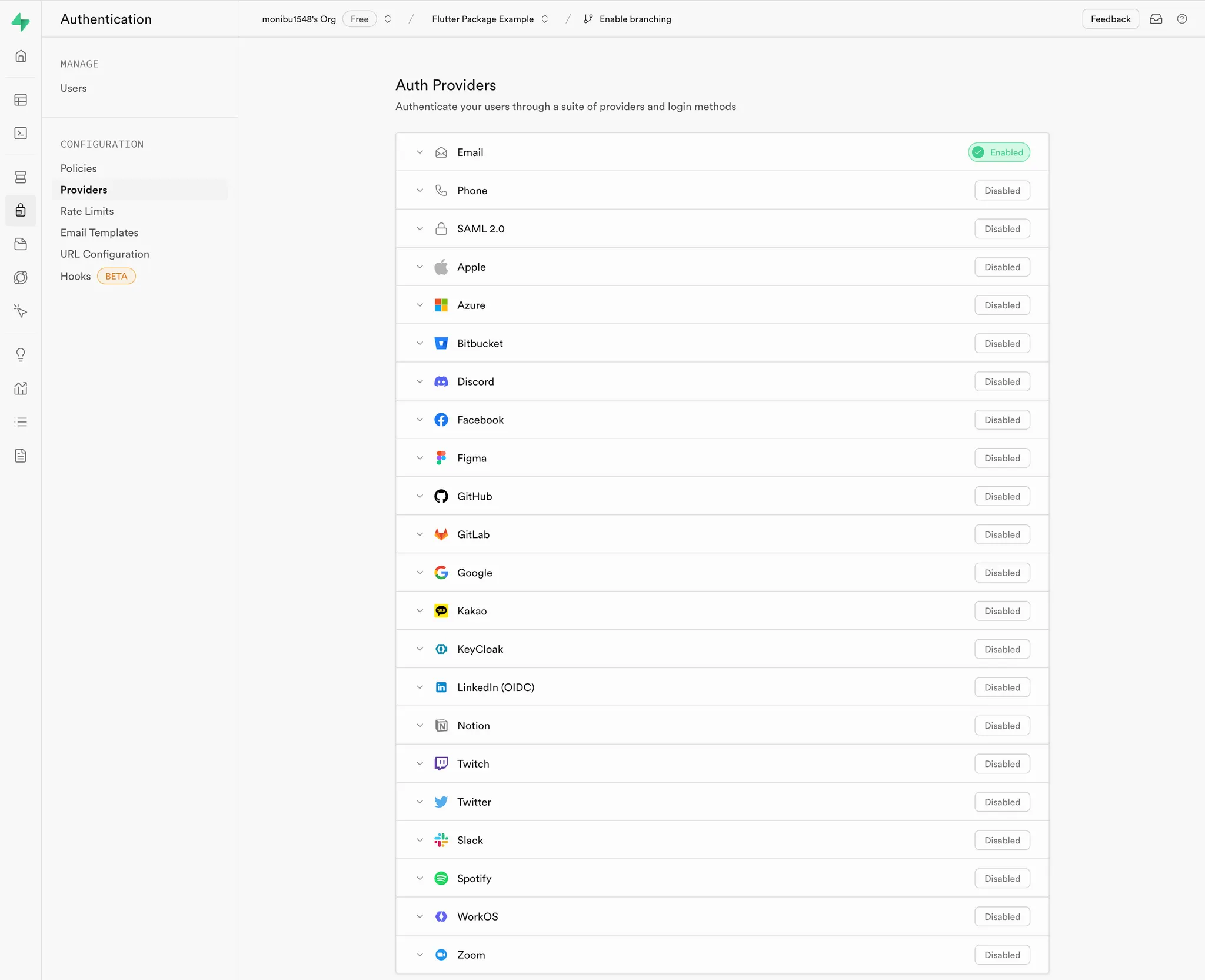 현재 Supabase에서 기본으로 지원하는 Third-party Provider 목록