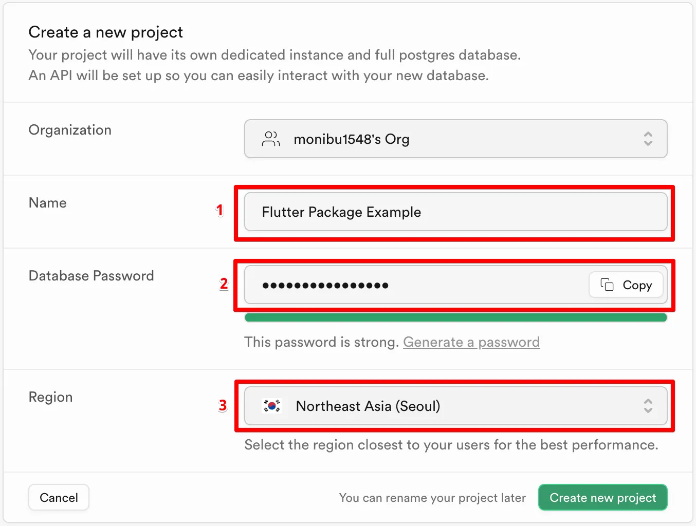 Region: Supabase를 호스팅 할 Region을 선택합니다. Seoul을 추천합니다.