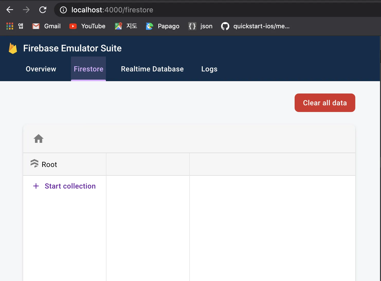 Firebase Emulaor Debug 화면에서 Firestore 도 Local 에서 테스트 할 수 있도록 세팅되었음을 확인할 수 있습니다
